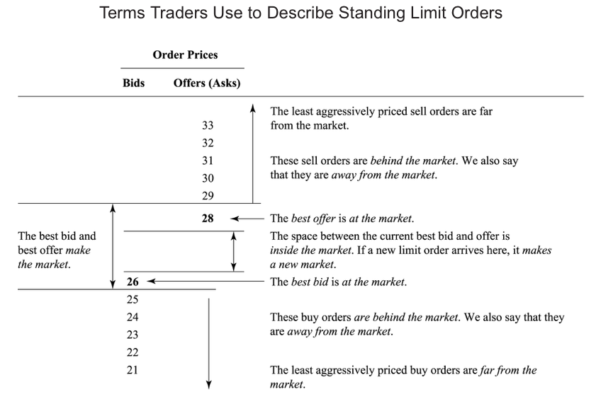 If the buy order is placed above the best bid but below the best offer, traders say the order makes a new market because it becomes the new best bid. Such orders generally will not immediately trade, but they may attract sellers who are interested in trading. A buy order placed at the best bid is said to make market. It may have to wait until all other buy orders at that price trade first. Finally, a buy order placed below the best bid is behind the market. It will not execute unless market prices drop. Traders call limit orders that are waiting to trade standing limit orders.