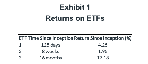 8. An investor is evaluating the returns of three recently formed ETFs. Selected return information on the ETFs is presented in Exhibit 1: